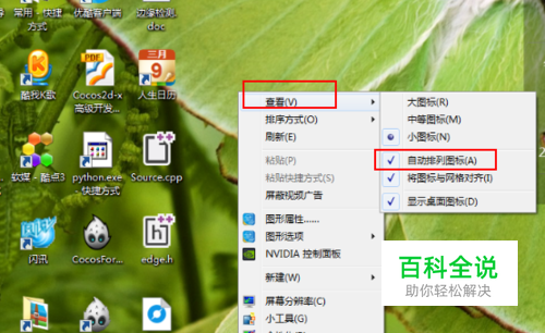 在桌面空白处右击鼠标,并按照下图指示取消勾选“自动排列图标”选项