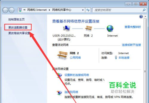 打开网络和共享中心设置窗口之后,我们点击左边的“更改适配器配置” 如图