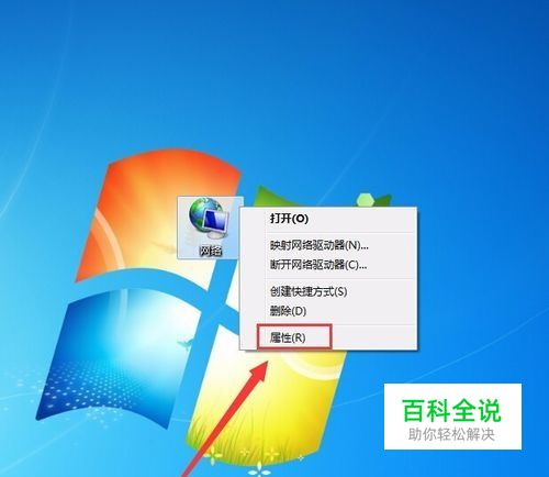 首先我们右键电脑桌面上的网络图标,在弹出的选项里,我们点击“属性” 如图