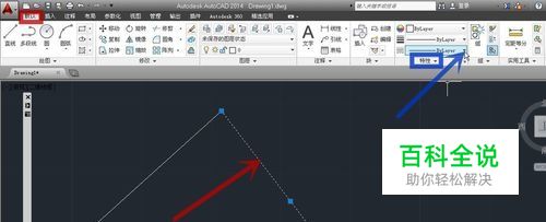 用鼠标左键单击选取边线(图中红色箭头所指),再点击“默认”选项卡(图中红框)中的“特性”选项组(图中蓝框)中的“线型”下拉三角形(图中蓝色箭头所指)
