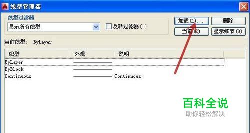 在弹出的“线型管理器”对话框中点击“加载”(图中红色箭头所指)