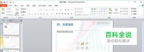 选中第15张幻灯片,单击“开始”里的“版式”按钮,选择“图片与标题”样式