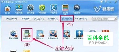 在毒霸的百宝箱窗口,左键点击:(1)金山会员,(2)数据恢复;