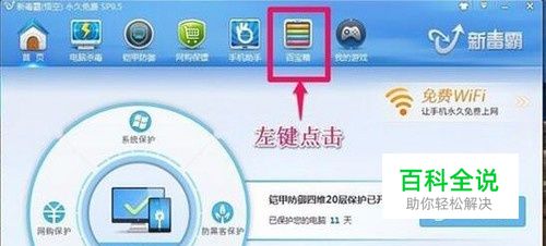 左键点击金山毒霸图标(右下角),启动金山毒霸,在打开的金山毒霸窗口,再点击:百宝箱;