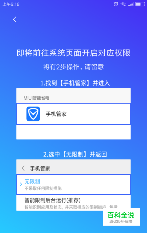 默认的是“智能限制后台运行”改为“无限制”,
