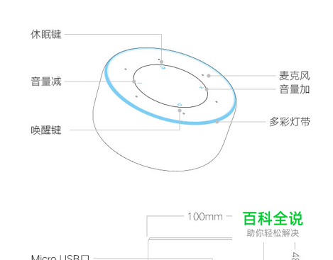 叮咚mini2 顶部有环绕着六个麦克风,识别更精准。顶部有四个操作按键,分别为【音量加减键】、【休眠键】和【唤醒键】。 音箱底部有一个micro usb充电接口和一个LINE OUT 输出口。