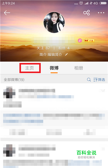 点击后会打开个人微博信息界面,查看注册时间需要在个人主页中查询,点击【主页】。