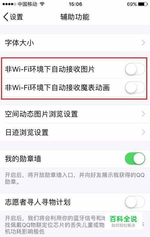 接着进入到辅助功能的设置窗口,可以看到选项中有两个非wifi环境下的选项,后边都是绿色的启动状态,此时是自动接收图片的状态。