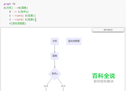 竖向流程图源码格式: ```mermaid graph TD A[方形] -->B(圆角) B --> C{条件a} C -->|a=1| D[结果1] C -->|a=2| E[结果2] F[竖向流程图] ```