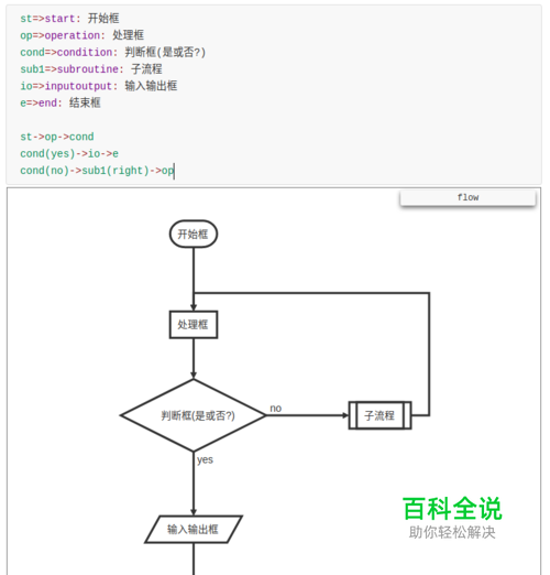 标准流程图源码格式: ```flow st=>start: 开始框 op=>operation: 处理框 cond=>condition: 判断框(是或否?) sub1=>subroutine: 子流程 io=>inputoutput: 输入输出框 e=>end: 结束框 st->op->cond cond(yes)->io->e cond(no)->sub1(right)->op ```