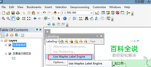 打开Maplex标注引擎。从ToolBars中打开Labeling工具,勾选Use Maplex Label Enginge,如下图所示:
