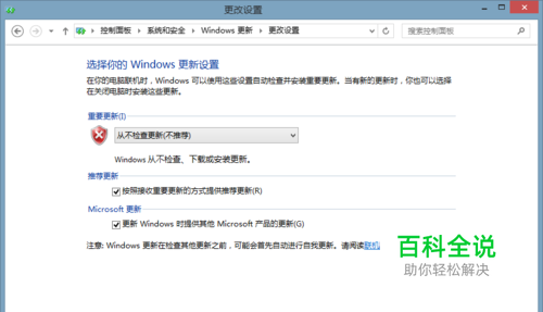 在“重要更新”栏中选择“从不检查更新”,在“推荐更新”和“ microsoft更新”前的对号勾除掉