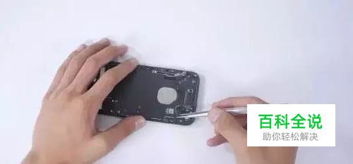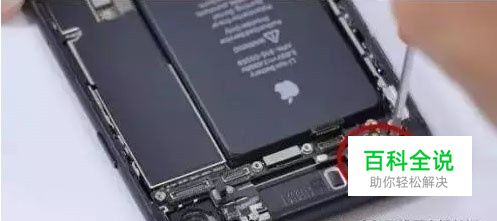取下iPhone7机身上的电池:拧下电池下方的保护罩螺丝钉,取下保护罩后断开排线链接器,拉开电池身上的两条易拉胶取出电池