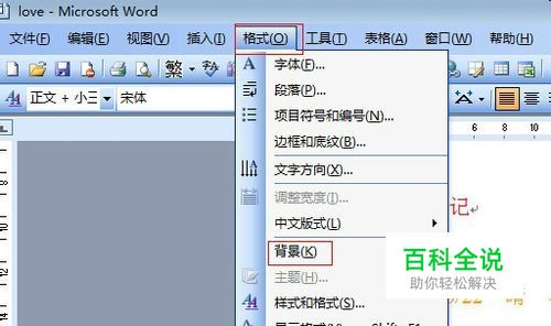 以下将日记为例,加一个背景图片以增加氛围! 打开你的文档,点击菜单-格式,找到:背景,如果没有看到的话,那就点击最下面的“更多”吧,如图