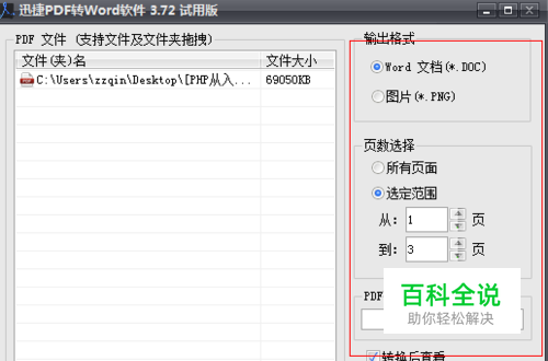 打开PDF转Word软件,在左下角添加你要转换格式的PDF文件,并在右侧选择页码。
