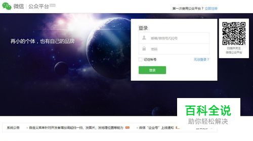 点击进入微信公众平台官网登录页面,点击右上角的“第一次使用公众平台?立即注册”中的立即注册蓝色字体,如图