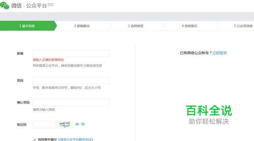 输入申请邮箱,密码,确认密码,验证码等,并且勾选底部的我同意并准守《微信公众平台服务协议》,然后点击注册按钮,如图