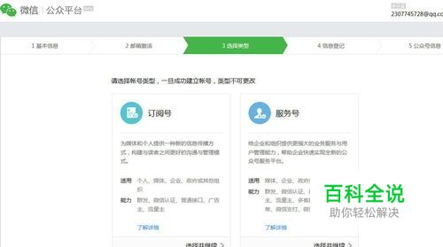 邮箱激活后即可登录,登录成功后需要填写公众账号信息 如图,选择公众号类型,订阅号或者服务号,账号类型一旦选择,不可更改的,此处小编选择的是服务号,请各位选择自己需要的类型,