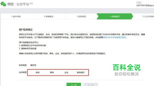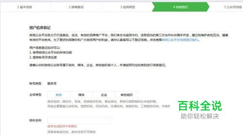 用户信息登记,会出现选择主体类型的页面,如图中红色圈出的部分,此处我们要申请的是政府类型的公众号,点击政府即可