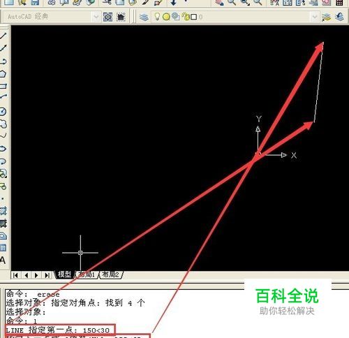 点击l 回车 调出直线命令 在命令栏后面输入150<30按回车之后 输入300<60回车 这里的第一个数字代表该点距离原点的距离 小于号代表角度 第二个数字代表与x轴的正向夹角