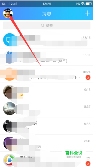 我们以QQ钱包的Q币充值为例,打开自己的手机QQ,进入到聊天页面,点击左上角的个人头像,左侧显示个人设置,点击其中的QQ钱包选项。