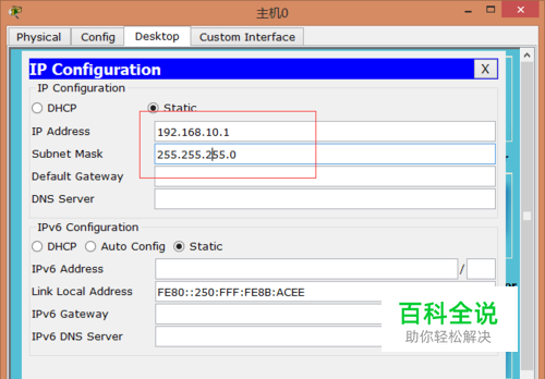 由于交换机默认打开状态,所以只配置,pc机的ip即可,下图是pc0的配置,把上下几个pc机也按照拓扑图上的ip进行配置。