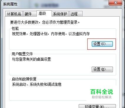 下来,在系统属性窗口中,选择“高级”选项卡,其实在上一步已经选择了“高级”选项卡了,无需再做这一步。直接点击“设置”