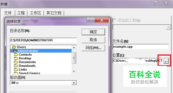 输入文件名,例如examle.cpp,然后点击红框处修改文件存放位置,然后单击确定。