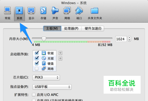 在虚拟机的设置界面中,点击 “系统”选项,然后就可以看到当前虚拟机的内存配置了。可以看到当前我的虚拟机内存为 1 G,如图所示