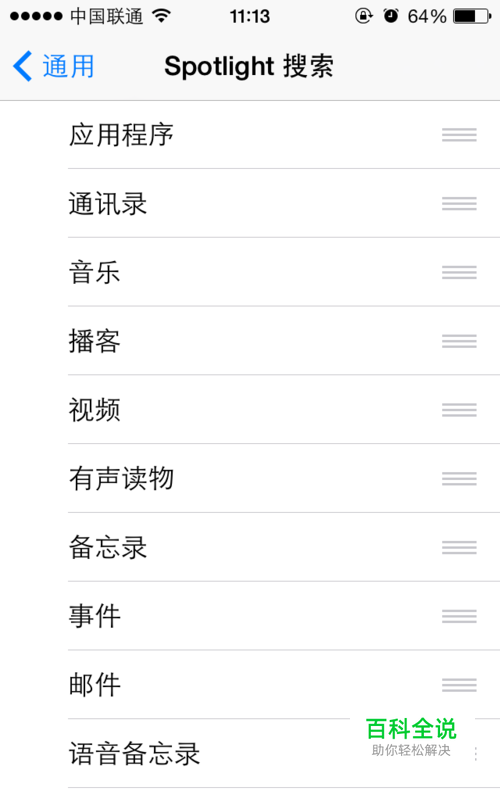 限制Spotlight搜索范围。 在”设置>通用>Spotlight搜索“中,你可以任意勾选你希望搜索的范围。
