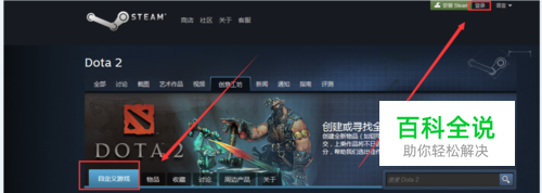 下载完后,你会发现自定义游戏里面什么都没有,也没有房间,这时打开浏览器,打开http://steamcommunity.com/workshop/browse/?appid=570§ion=readytouseitems ,也就是steam平台的dota2的创意工坊页面,点击右上角的登陆,用dota2账号登陆即可,然后选择自定义游戏选项。