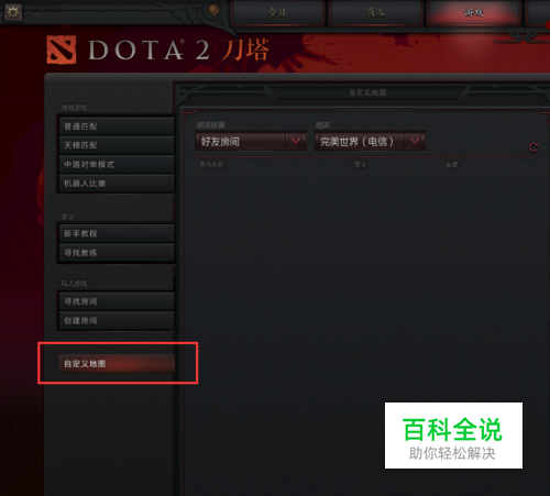 首先,进入dota2客户端,在游戏页面找到最下方的自定游戏选项,第一次选这个是会叫你下载一个5个多G的创意工坊的工具,点击下载就行了,不会影响正常游戏,在dota2启动器的下载栏可以看到下载的进度。