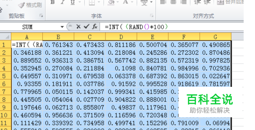 但是这些随机数都是有小数位的,而且整数位只到个位,我们要得到两位数的随机数,首先“*100”,然后利用函数Int()对结果取整,即完整的公式是:=Int(rand()*100)。最后,按“Ctrl+enter”即可。