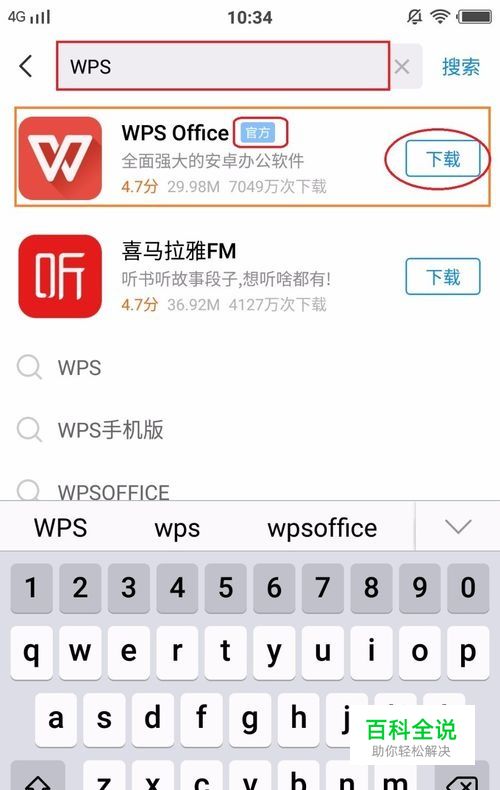 在弹出的搜索栏中,输入wps,在搜索列表中,找到 wps office 软件在左上角有【官方】的字样,点击下载进行自动安装。