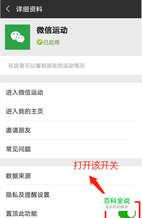 在微信运动”详细资料“窗口中,找到置顶选项并打开此功能。