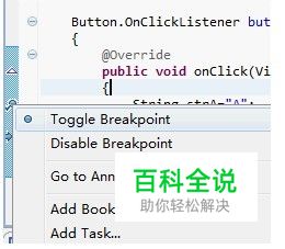 设置断点:在编码窗体的左边框上用鼠标双击,或者右键点击菜单,选择 Toggle Breakpoint菜单项即可.