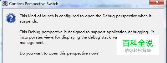 在debug模式下运行程序进入调试状态:通过点击工具栏上的小虫按钮或者是在项目右键点击然后选择Debug As,Android Application菜单,启动程序的调试模式.第一次运行调试模式eclipse会弹出如下确认窗口