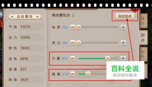 点击‘自动加点’进入下图模式,按图红方框所示,力加三点,敏加一点,点击‘开启自动’,这样角色升级的时候自动进行属性点分配了