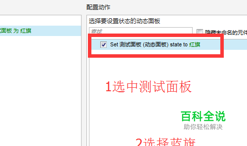 选择 元件-->设置面板状态 ,然后按照图示选中 “测试面板”,并为其设置选择状态为:蓝旗。同时设定动画效果。
