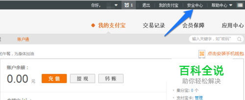成功登录支付宝以后,点击首页顶部的 “安全中心”选项,如图所示