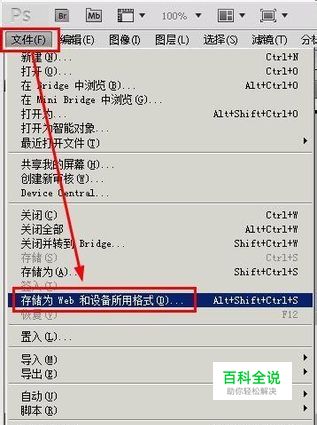 先跟大家介绍一个最常用的方法,那就是导出为web所用格式,如图所示,我们制作好图片以后,在菜单栏上执行:文件--存储为web和设备所用格式