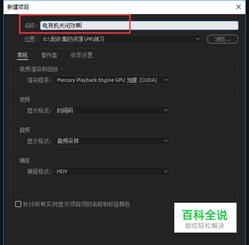 双击打开安装的PR视频剪辑软件,然后新建一个项目,在弹出的新建项目窗口中,将我们新建的项目名称命名为“电视机关闭效果”,选择一个保存位置,其他设置保持默认即可。