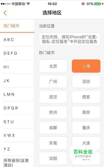 或者是,如果你所在的地区是热门城市,比如北上广深,只要点击选择地区最上面一行的热门城市就可以看到所有热门城市地区,或者是手机开打定位服务,直接定位到你所在地区城市