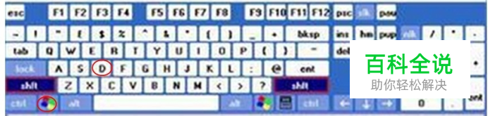 1.看到下面的键盘了吗,找到你的电脑键,先按住下面那个系统键不要放,再用另外一个手指按住D: