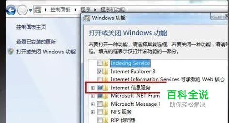 点击电脑开始——控制面板--程序--程序与功能--点击打开或关闭windows功能,在弹出的界面中,选择Internet 信息服务。