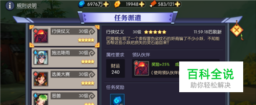 此外,每个任务都有一个领队伙伴,若您的伙伴队伍中正好有这个任务所需的领队伙伴,派出它即可享受任务成功率加成和奖励加成。 伙伴生活属性要求:财运,智力,感知,魅力,勇气。 领队伙伴:根据系统任务而定。 伙伴限制:主角不能被派遣。