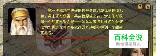 男士可以将女士选定的愿望礼物带来挂到树上,第一次为别人实现愿望可获得写着该位女士名字的浓情愿望之花,并获得一个结良缘礼包。之后为别人实现愿望可获得甜蜜蜜礼包。