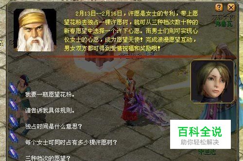 许愿成功后,女士可独占许愿树30分钟,独占时间内其他人无法向这棵树许愿。每隔5分钟还可花费10000金币点击许愿树,向全世界宣告自己的愿望。