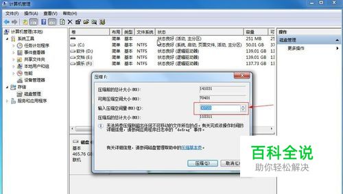 然后填写你想要分给新加卷的容量,这里是按MB计算的,1024MB=1G 建议分30G以上的空间,30G就是30*1024=30720,再点击压缩。