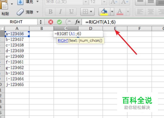 我们点击选中C1单元格,然后在公式栏上输入函数:=RIGHT(A1;6)。 这是利用right函数来处理,意思是取A1单元格的数据,然后从右边起取6位。